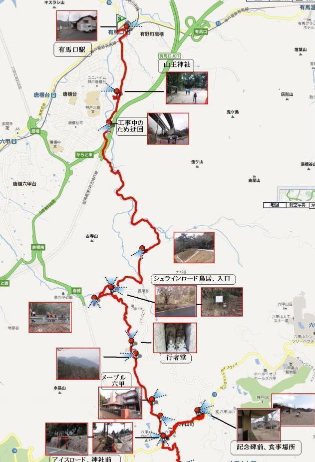 コース 9時発 有馬温泉行きバス⇒有馬温泉口(10時)→シュライン(神社)・ロード→記念碑台(昼食)→