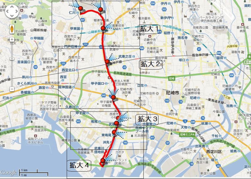 コース 仁川駅→一里山歩道橋→甲武橋→上武庫橋→武庫大橋→南武橋→武庫川西岸最南端→阪神武庫川線武庫川団地前