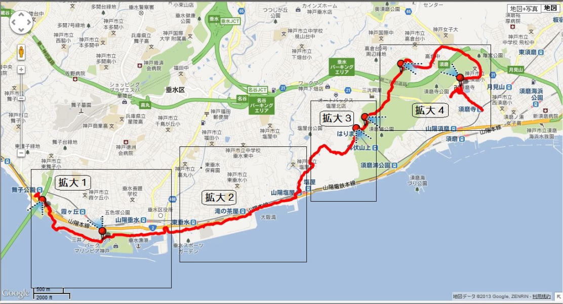 コース 舞子海岸→塩屋駅→噴水ランド→旗振山→おらが茶屋→須磨寺→山陽電鉄須磨寺駅