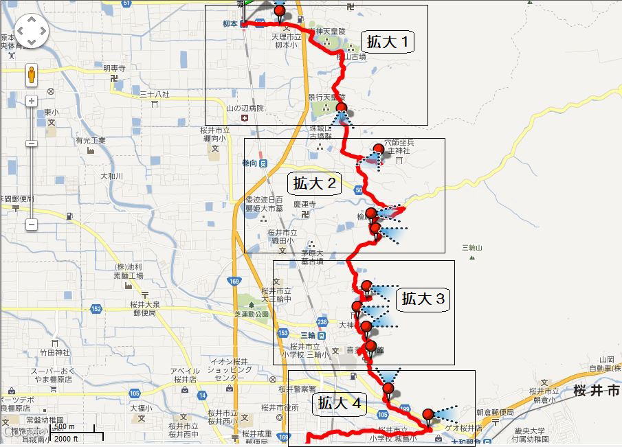 コース 柳本駅→黒塚古墳→崇神天皇陵→景行天皇陵→山の辺の道ビューポイント→景行天皇宮跡→相撲神社→桧原神社→